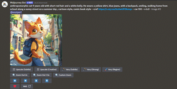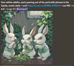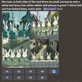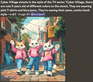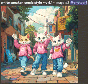 Далее доработали картинку в PH, и вуаля — перед вами зайчики-блогеры! Аналогично было с котятами. Пришлось дорисовать отдельно лапки с помощью точечного инструмента Vary (Region) в Midjorney. Выделив нужную область в редакторе и написав промт о том, что необходим белый кроссовок, получили идеальный вариант.