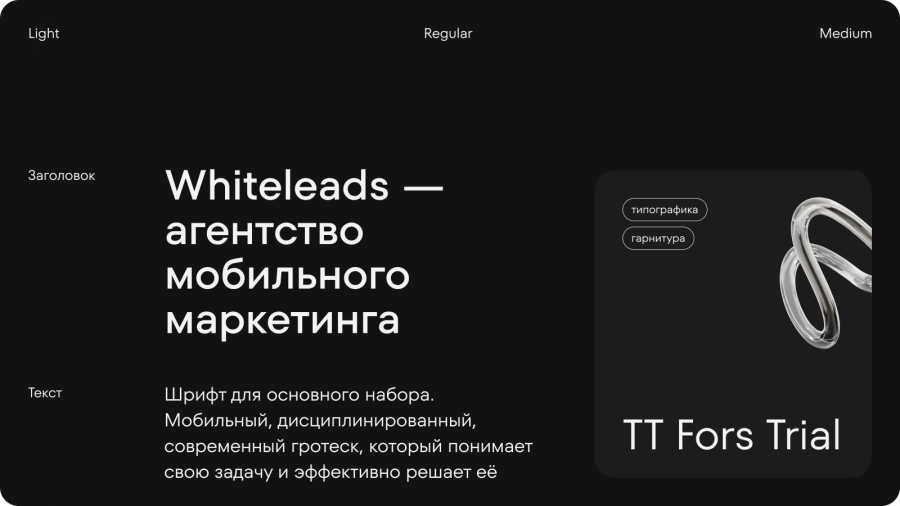 В типографике агентство остановило выбор на TT Fors Trial от TypeType — функциональном гротеске с выверенными пропорциями.