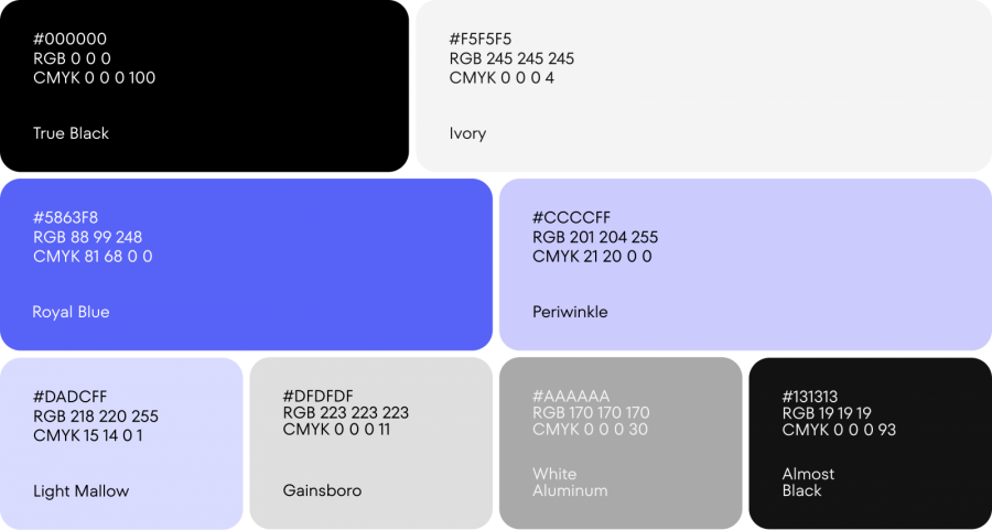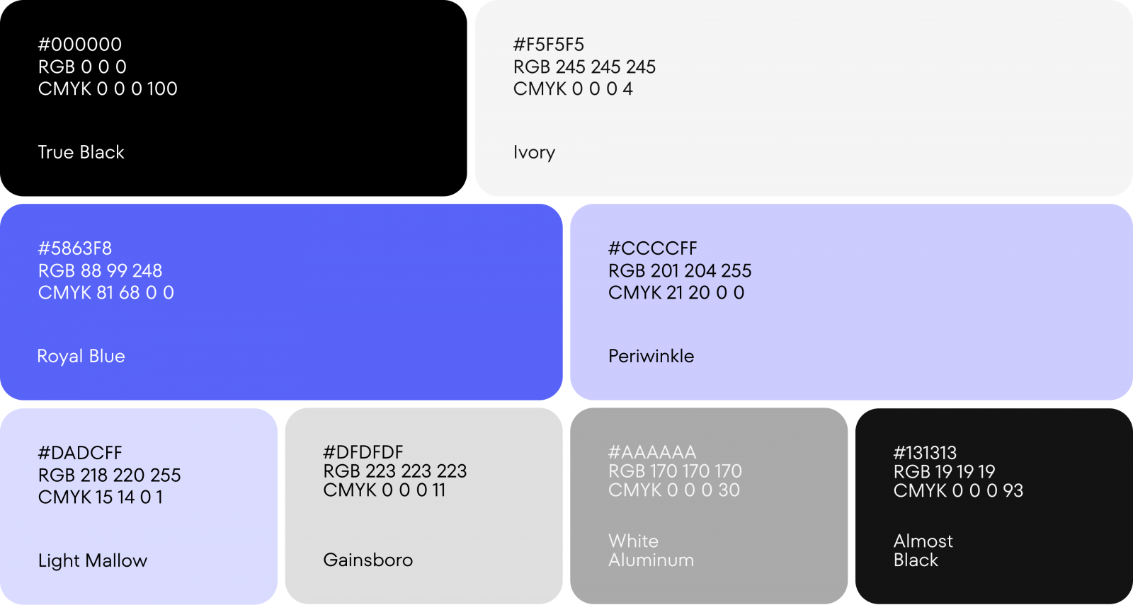 Цветовая палитра полностью переосмыслена. Исчезли зелёный и мятный. Базовые цвета — черный и слоновая кость — отражают архетип «правителя»: строгость, уверенность, точность. Акцентные синий и сиреневый символизируют архетип «героя» —амбициозность и стремление к развитию. Дополнительные серые оттенки подчеркивают исследовательский R&D подход агентства.