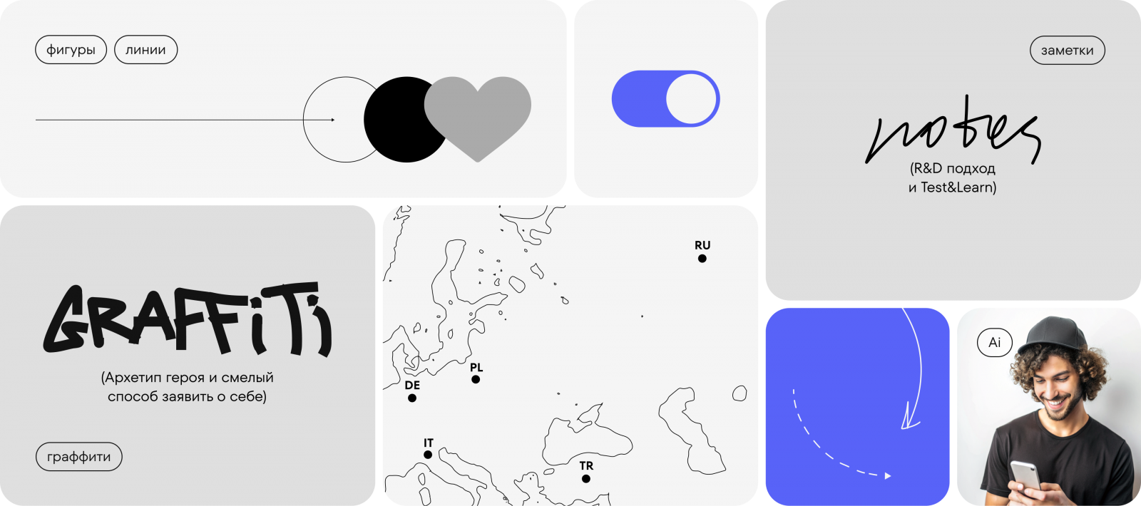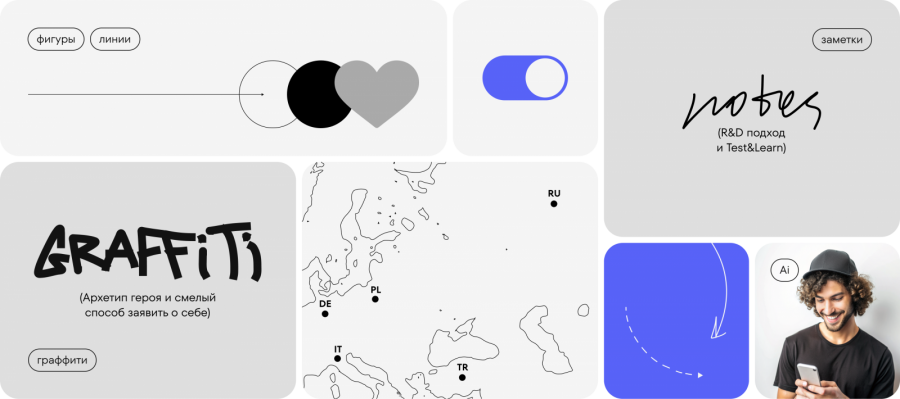 Особое внимание уделено микрографике — плоским фигурам, линиям и рукописным элементам, которые визуализируют исследовательский подход компании. Неожиданным элементом стали граффити для акцидентных заголовков — решение, подчеркивающее архетип «героя» в позиционировании бренда.