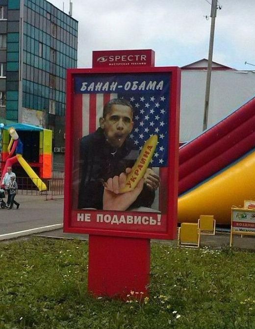 На баннерах, которые заинтересовали УФАС, помимо фотографии самого президента США, также присутствуют изображения барана с национальным флагом США и банана с надписью «Украина».