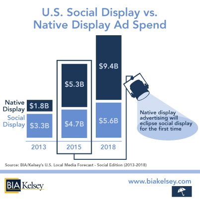 Одними из первых нативную рекламу стали внедрять социальные медиа. По данным исследования компании BIA/Kelsey объем рынка нативной рекламы с социальных медиа в США в 2015 году составит 5,3 млрд долларов. При этом заметна очень интересная тенденция, что доля нативной рекламы впервые с 2013 года превысит долю традиционной рекламы в соцмедиа и достигнет 9,4 млрд долларов в 2018 году по сравнению с 5,6 млрд долларов, затраченных на обычную social advertising.