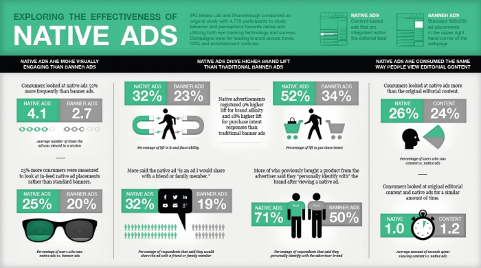 Так, по данным американского исследования IPG Media Lab и Sharethrough, имея дело с нативной рекламой, пользователи гораздо более охотно ассоциируют себя с брендом (+ 42%), чаще замечают (+52%) и расшаривают (+68%) сообщение в сравнении с традиционными баннерами. И нативная реклама в 1,5 раза больше стимулирует к покупке в интернете.