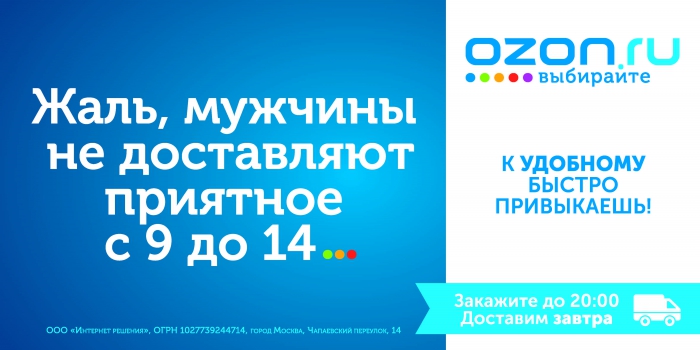 В новогодние праздники онлайн-гипермаркет Ozon.ru в рамках обновленного позиционирования, которое было представлено в ноябре прошлого года, запустил новую рекламную кампанию. Три рекламных ролика появились в эфире телеканалов Москвы и Санкт-Петербурга 3 января и будут транслироваться до марта. С 19 января кампания также будет поддержана наружной рекламой.