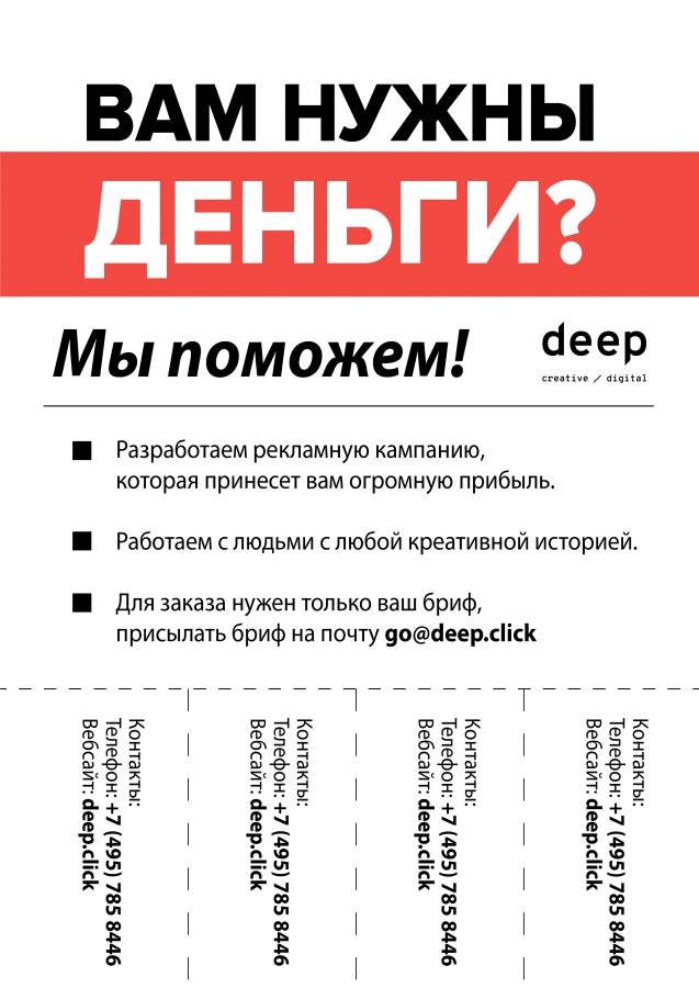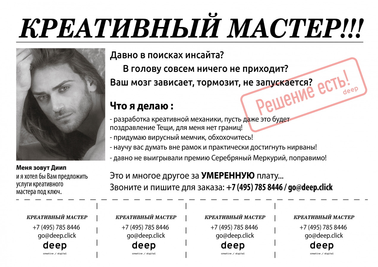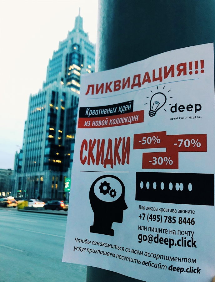 deep — creative digital agency. Достаточно молодое, чтобы вы слышали о нас впервые, и достаточно креативное, чтобы это было не так. Каждый день в своей работе мы тестируем и применяем новейшие технологии и обычно держим большинство наработок в секрете. Но сегодня уникальный день. Мы откроем вам секреты использования самого эффективного рекламного инструмента — таргетированных офлайн ТГБ.