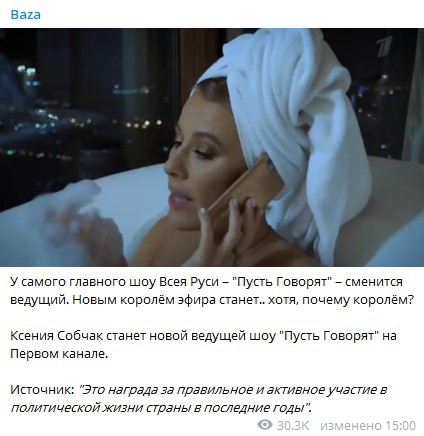 Обращаясь к собеседнику, Ксения произносит: «Привет, Андрей! Представляешь, он мне сделал предложение, от которого невозможно отказаться. Оно изменит всю мою жизнь». Ранее в Telegram-канале Baza появилась информация о том, что Собчак станет новой ведущей популярного шоу «Пусть говорят».