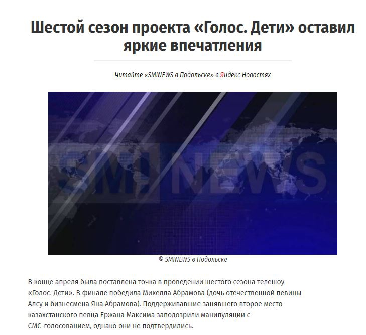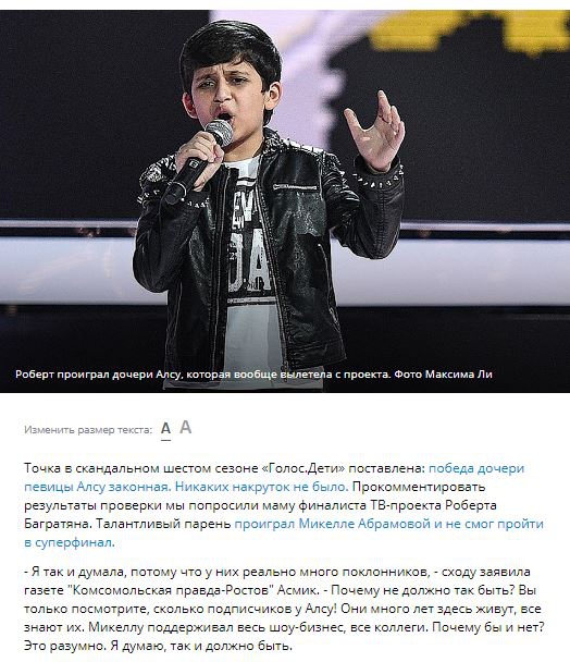 Команду Микеллы Абрамовой заподозрили в запуске PR-кампании, направленной на «обеление» победы девочки в шестом сезоне проекта «Голос. Дети». Публикации с фактическими и грамматическими ошибками появились на сайте «Комсомольской правды». В одной из них сообщается, что партнер «Первого канала» не обнаружил доказательств фальсификаций при голосовании. Однако официальная проверка, которой занимается международная компания Group-IB, еще не завершена.