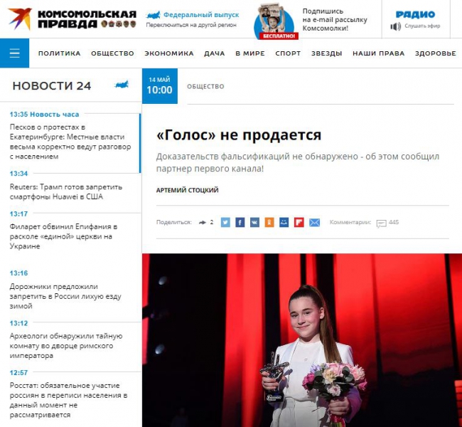 На заказной характер материалов «Комсомольской правды» обратили внимание Telegram-каналы «Беспощадный пиарщик» и «Медиасрачи». Автор статьи ««Голос» не продается» ссылается на официальный отчет компании «СМС сервисы», которая отвечает за техническое сопровождение онлайн-голосования в телешоу «Голос» и «Голос.Дети». Только в информационном сообщении фирмы говорится: «В момент проведения голосования платформа не подвергалась DDOS или иным хакерским атакам». Представители «СМС сервисов» нигде не заявляют о завершении проверки. Наоборот, там уточняют, что передали детальный отчет и статистику «Первому каналу» для изучения.