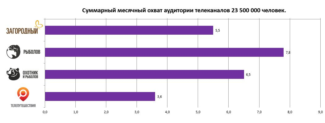 К нам обратился рекламодатель, и в процессе общения мы выяснили, что часто его клиенты увлекаются охотой и рыбалкой, имеют загородный дом и в общем ценят эстетику отдыха на природе, поэтому сформировали план размещения роликов сразу на четырех телеканалах — «Загородный», «Рыболов», «Охотник и рыболов» и «Телепутешествия». Суммарный охват кампании составил 23,5 млн человек.