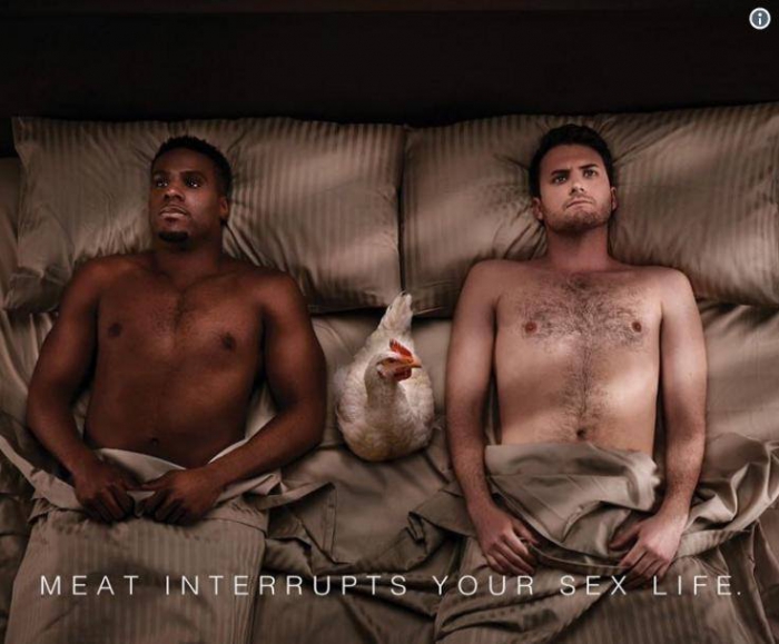 На билбордах изображены разочарованные разнополые и однополые пары, разделённые в кровати животными— коровой, курицей и свиньей. «Мясо мешает вашей половой жизни», — гласит надпись на плакатах.