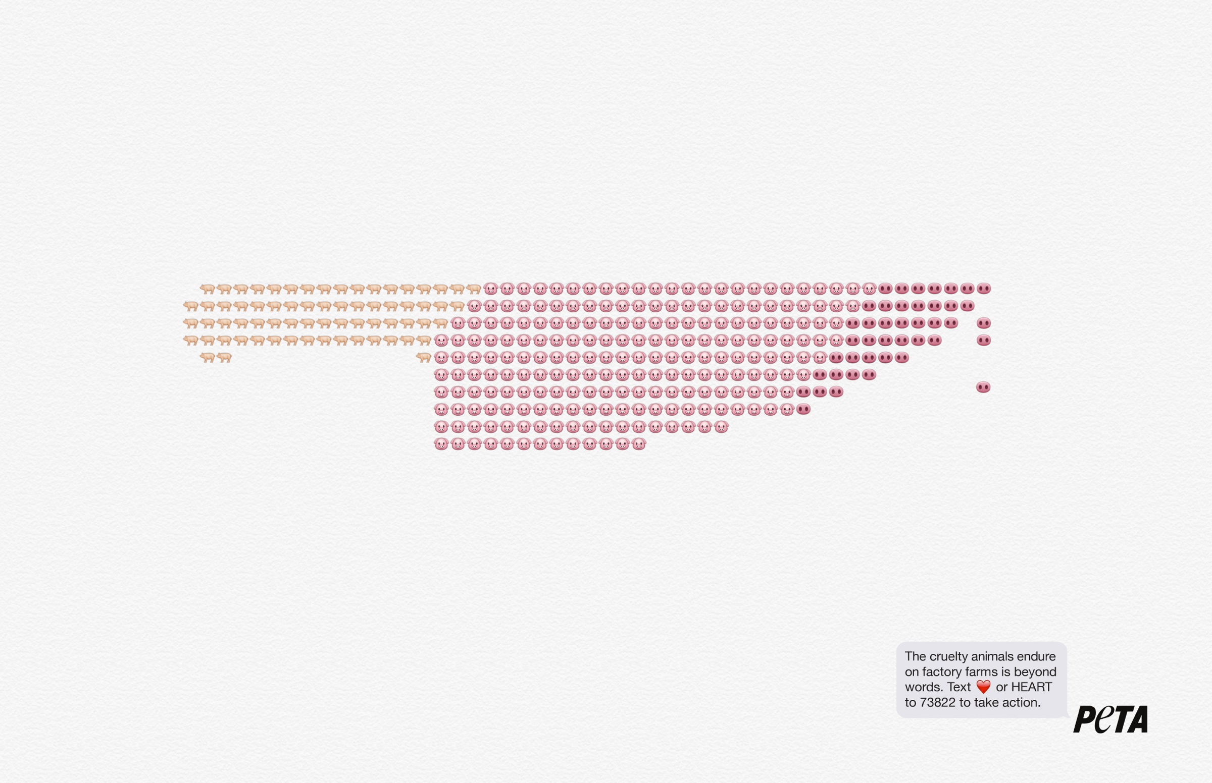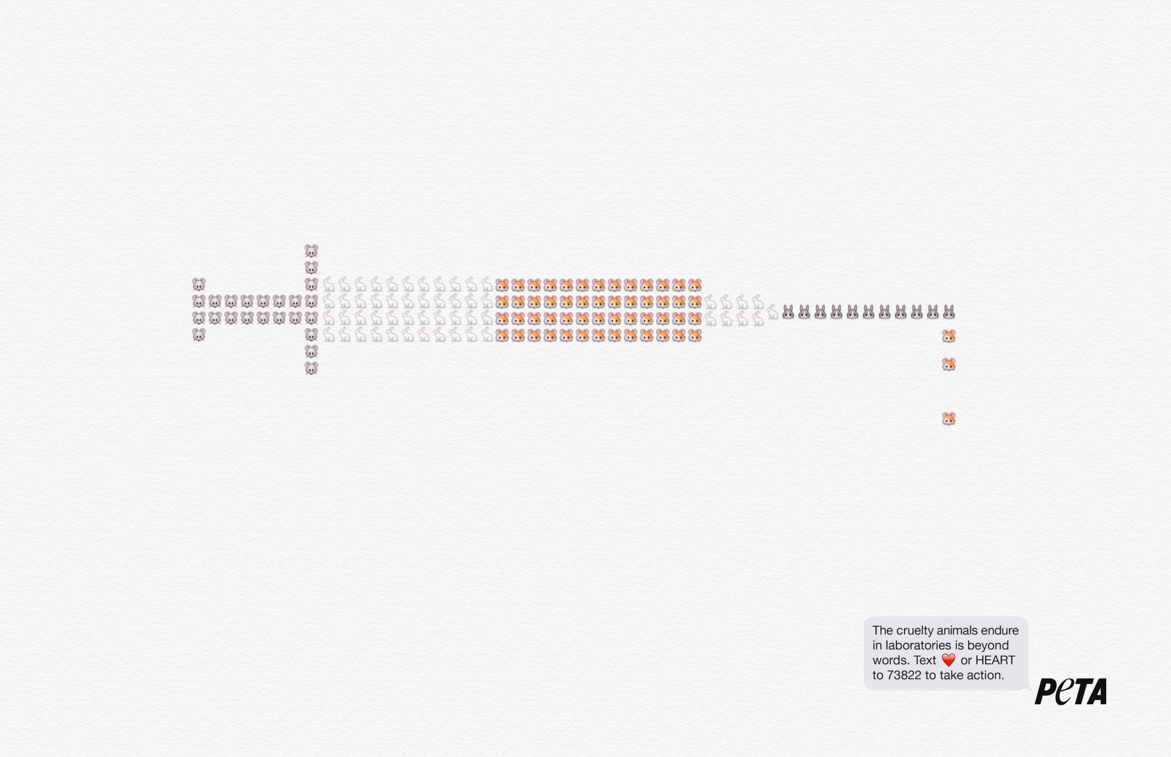 Международная организация по защите прав животных PETA запустила кампанию «Не описать словами» (Beyond words). Агентство BPG использовали смайлики-эмоджи для рекламных принтов и ролика о жестоком обращении с животными.