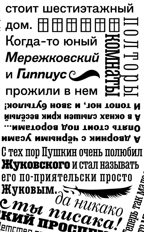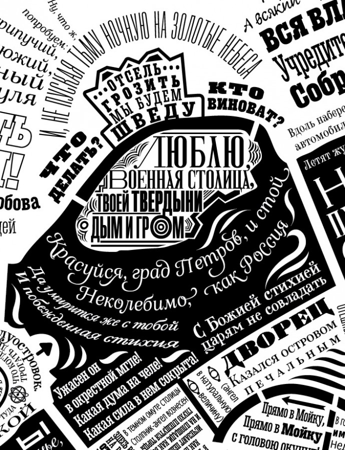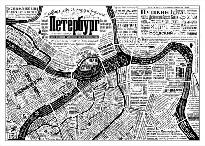 Российский дизайнер, шрифтовик и совладелец студии Letterhead Юрий Гордон разработал карту старого литературного Петербурга, получившую название «От окраины к центру. Говорит город». Типографическая карта северной столицы состоит из цитат известнейших русских писателей и поэтов, проживавших в городе на Неве.