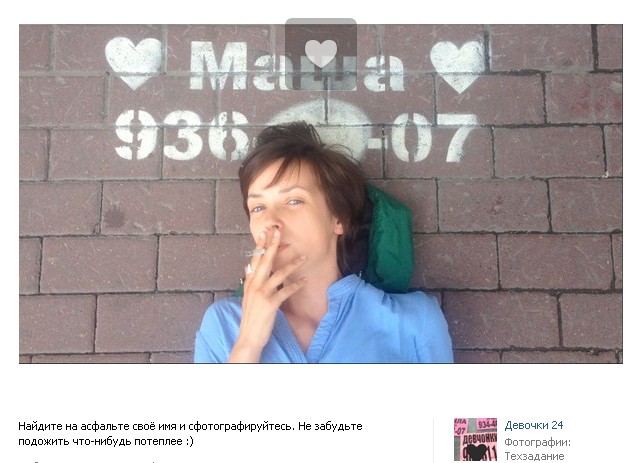 Организаторы группы предлагают желающим определенные техзадания. Так, например, добровольцев просят найти на асфальте рекламу интим-услуг со своим именем, сфотографировать