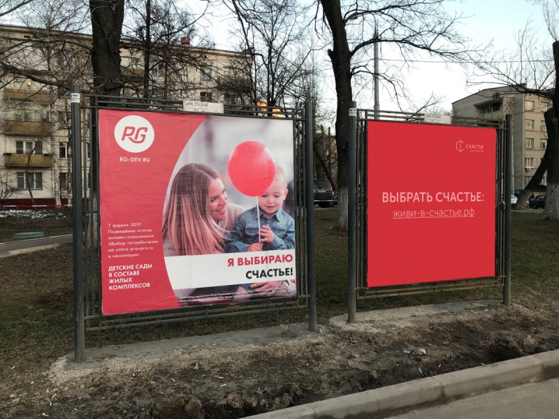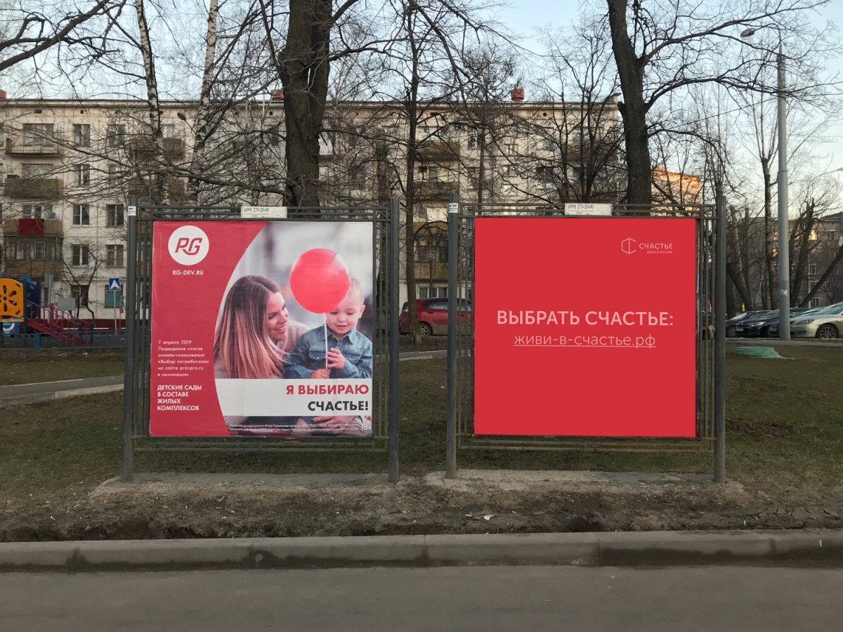 В начале апреля крупная строительная компания «RG» разместила рекламную афишу с посылом «Я выбираю счастье!». Этим решил воспользоваться другой девелопер — «Лидер-Инвест», который строит дома в Москве под брендом «Счастье».