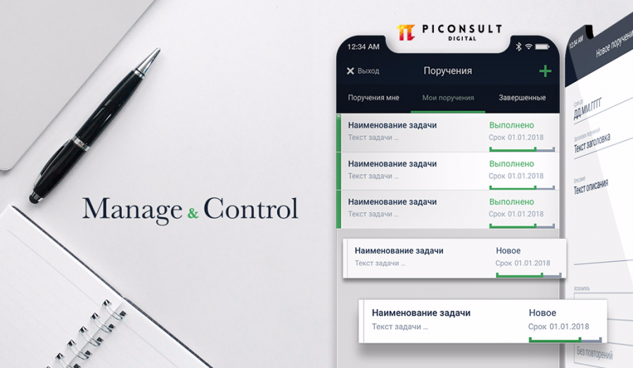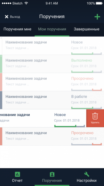 Для реализации дизайна приложения Manage & Control были выбраны два важных критерия: минимализм и лаконичность. Пользовательское восприятие визуальных элементов было максимально облегчено. Именно по этой причине во вкладке поручений дополнительные функции конкретных ячеек задач изначально скрыты, и отображаются при слайде строки влево и вправо.