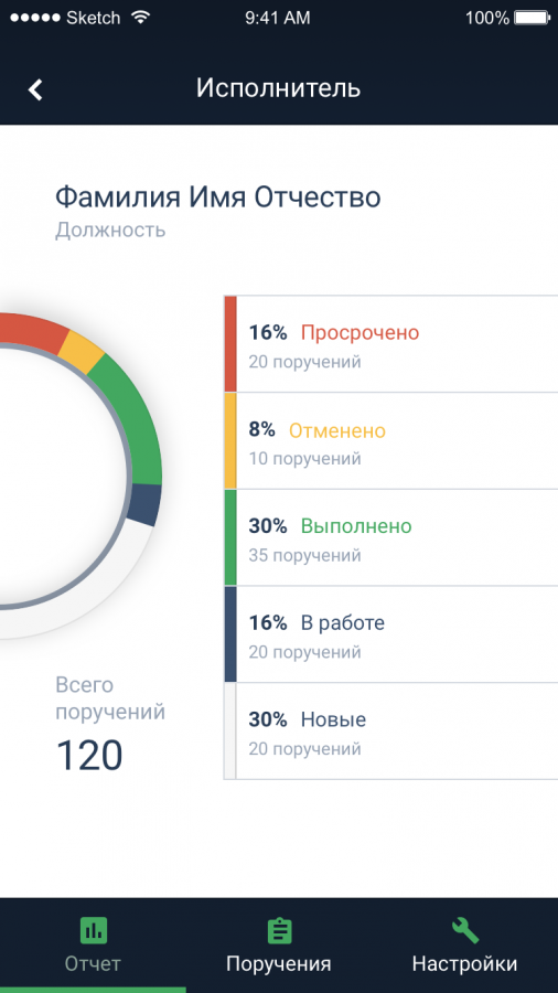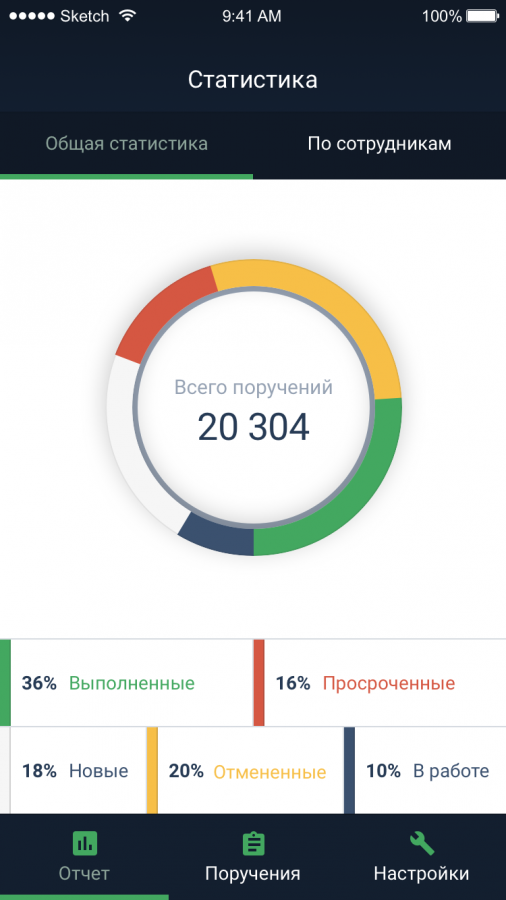 Одним из ключевых этапов разработки дизайн-концепции была проработка экранов аналитики. Для отображения ключевых показателей эффективности работы сотрудников был выбран «пирог» с функцией активации и деактивации конкретных категорий задач для формирования статистики в соотношении с их общим количеством.