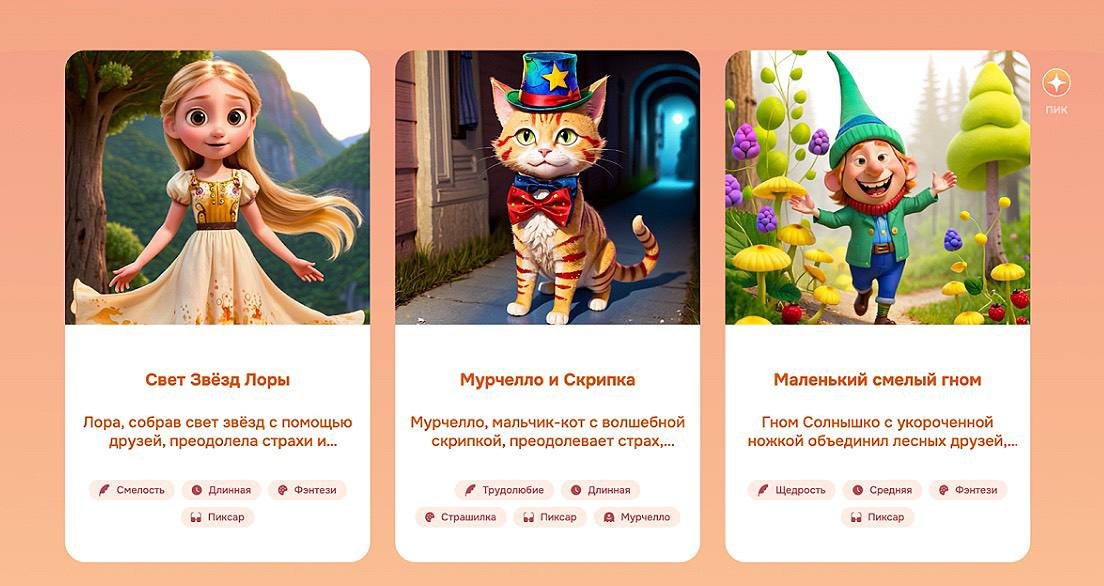 Родители выбирают сюжет, героев, мораль и стиль иллюстраций, а нейросеть помогает добавить детали, например, имя ребенка или его увлечения, и на основе этой информации создает уникальную историю. Готовую сказку можно прочитать или послушать с озвучкой тремя разными голосами.