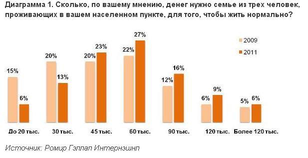 Интересно отметить тот факт, что показатель сравнялся с показателем 2011 года, когда, по мнению жителей России, для нормальной жизни в среднем им было необходимо 65,7 тыс. руб. в месяц. Однако тогда желаемый уровень дохода превосходил реальный примерно в 1,4 раза. Сейчас, с учётом того, что средняя зарплата в России в 2018−2019 годах равна сумме в 36 тыс. рублей, желаемый уровень превосходит реальный в 1,8 раз.