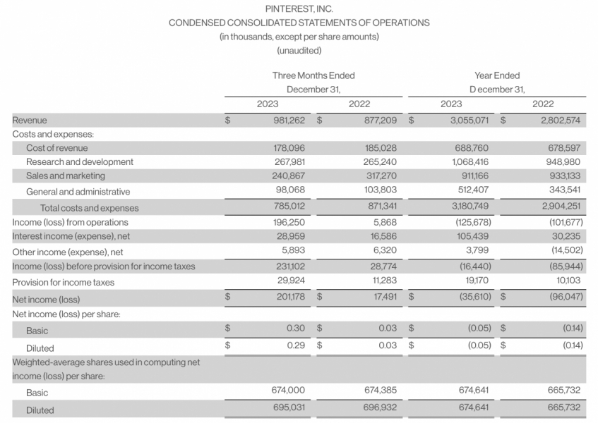 Квартальная выручка Pinterest увеличилась на 12%, до $981,3 млн. За весь 2023 год показатель превысил $3 млрд. Для сравнения: за 2022 год выручка составила $2,8 млрд.