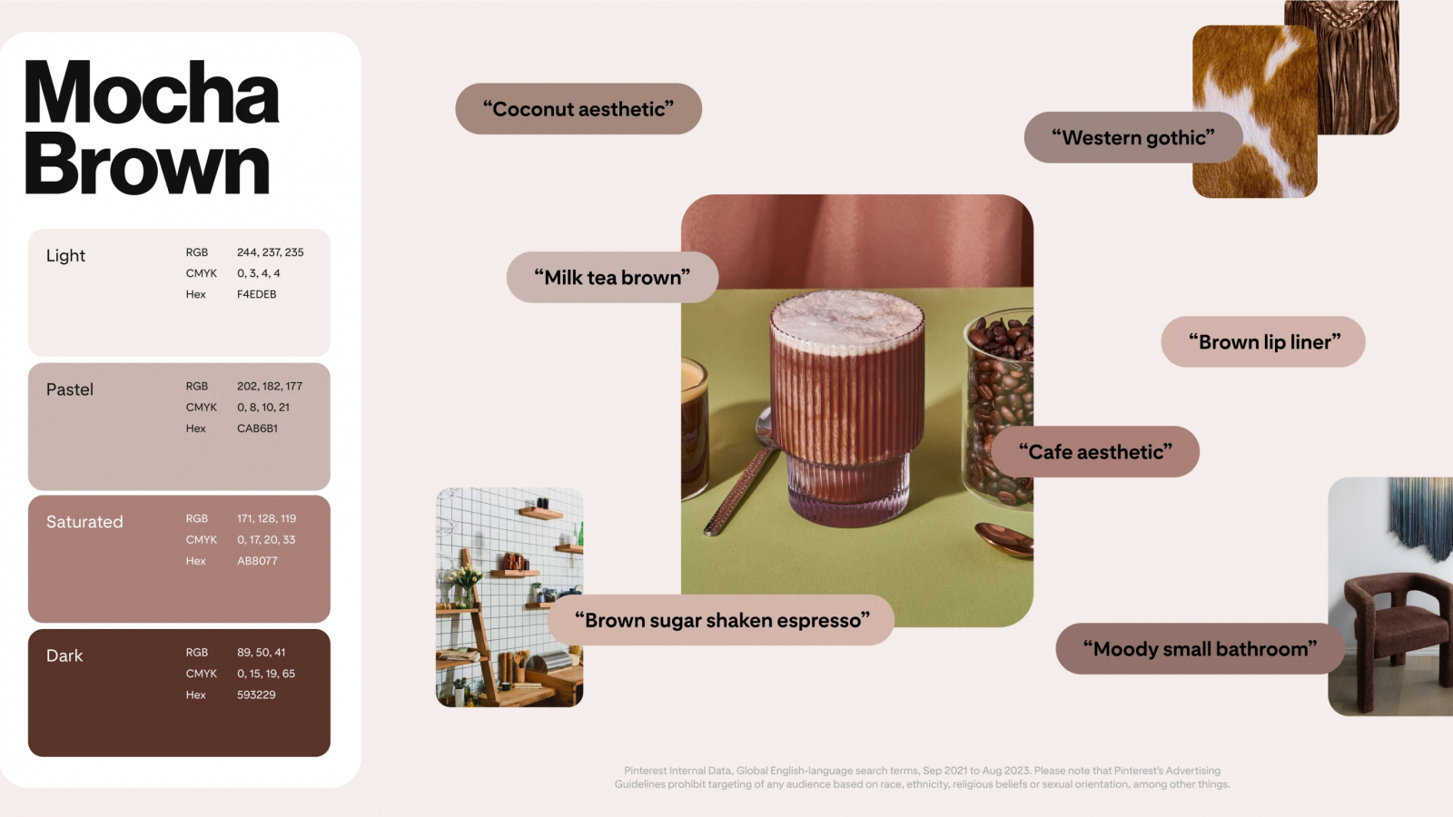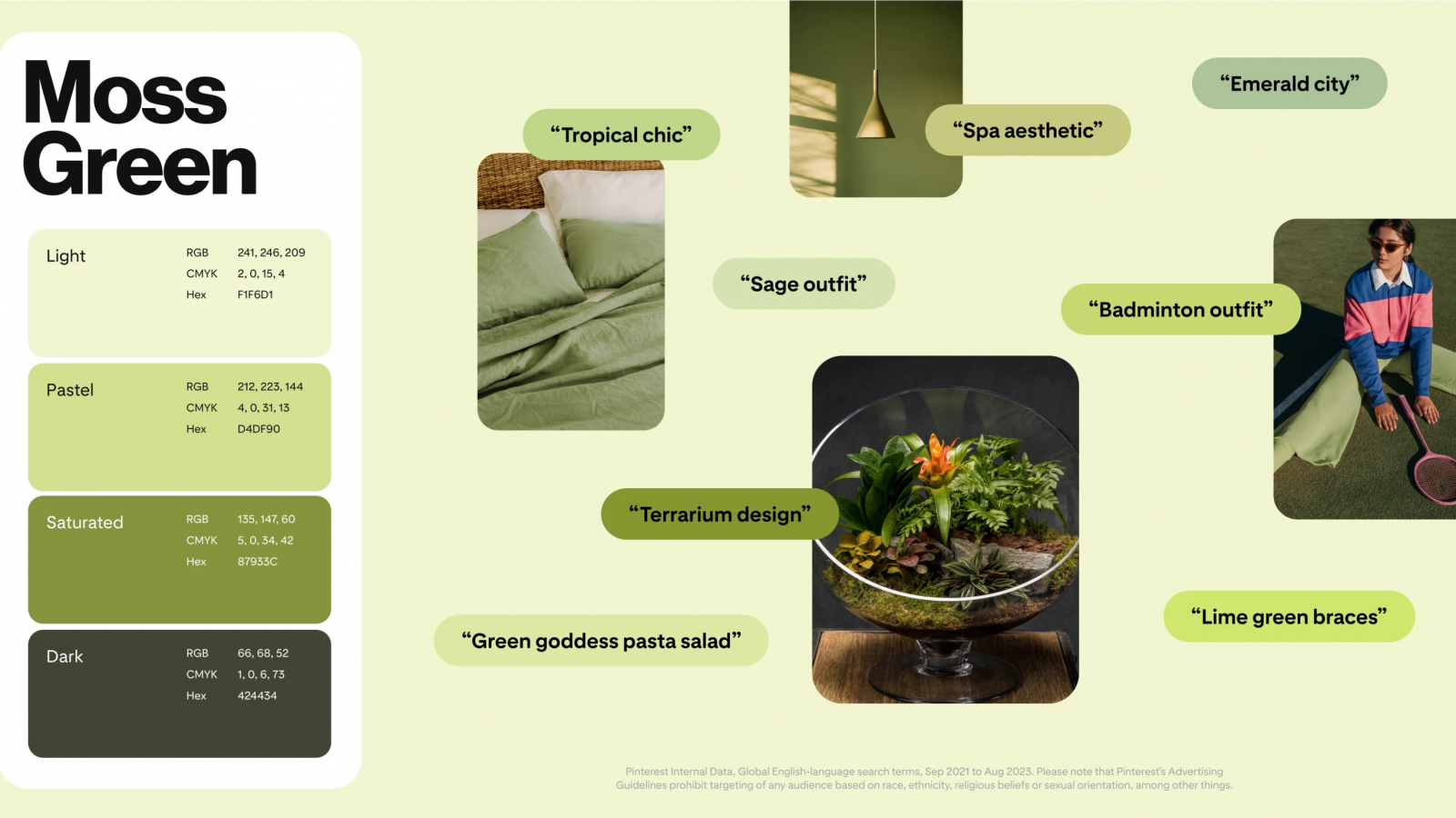 В этом году креативная команда Pinterest проанализировала тенденции Pinterest Predicts 2024 и выделила поисковые запросы, связанные с цветами. Затем были выбраны описания самых распространённых оттенков, встречающихся среди популярных ключевых слов.