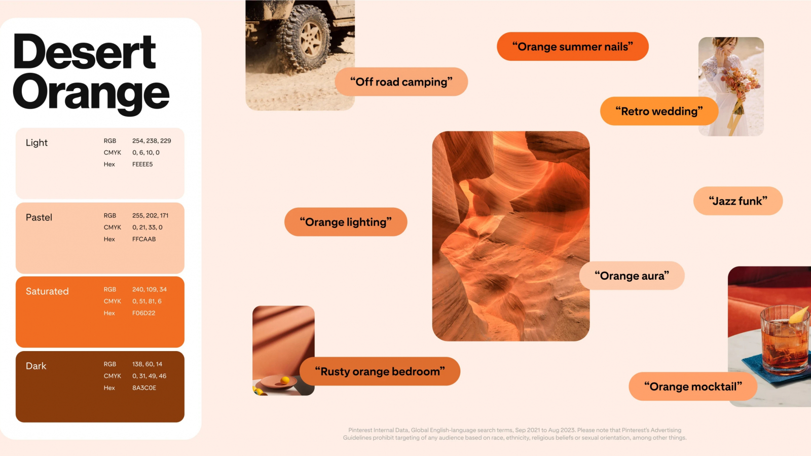 Эксперты Pinterest характеризуют цвет как насыщенный, яркий и тёплый. Оранжевый цвет в этом году выбран на основе тенденций Dirt Flirts (путешествия, превращающиеся во «внедорожный спорт»), Groovy Nuptials (ретро, диско и свадьбы в стиле 1970-х) и Jazz Revival (винтажный джаз).