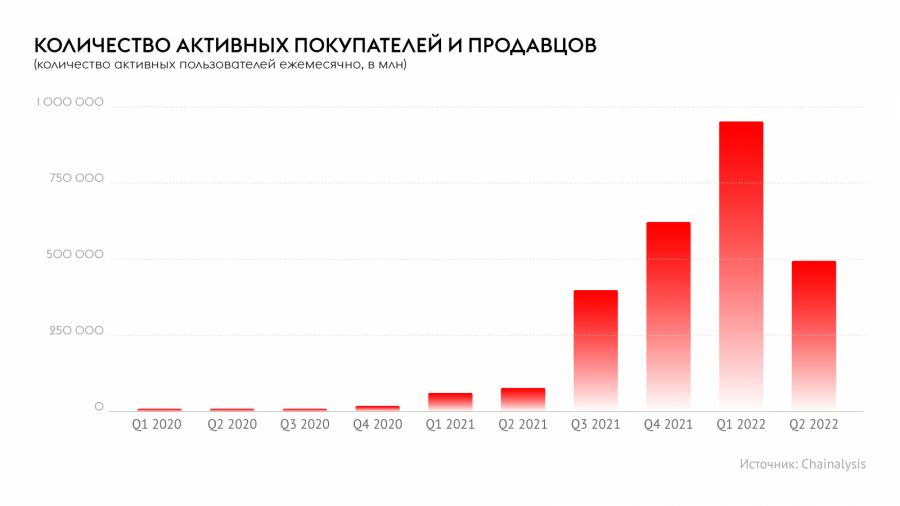 Сооснователь NFT-экосистемы CLC Антон Гусев говорит о снижении темпов роста и небольшой просадке в июле и подчёркивает, что в целом по году, по данным Nansen, объём рынка, количество продаж и число активных пользователей NFT в 2022 году в несколько раз превышает результаты за предыдущий год. По информации Chinalysis, в первом квартале 2022 года владельцы 950 тыс. уникальных кошельков купили или продали NFT, по сравнению с 627 тыс. в четвёртом квартале предыдущего года.
