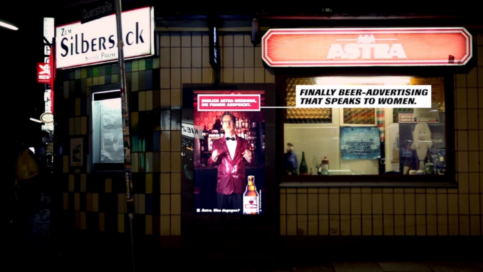 Пивной бренд Astra решил обратиться напрямую к женской аудитории, не размениваясь на мужчин и избегая несовершеннолетних. Проблему решило немецкое креативное агентство Philipp und Keuntje, которое создало цифровой билборд, способный определять пол прохожих. Конструкция была установлена на пабе Zum Silbersack в Гамбурге, чтобы как можно больше женщин попробовали пиво Astra.