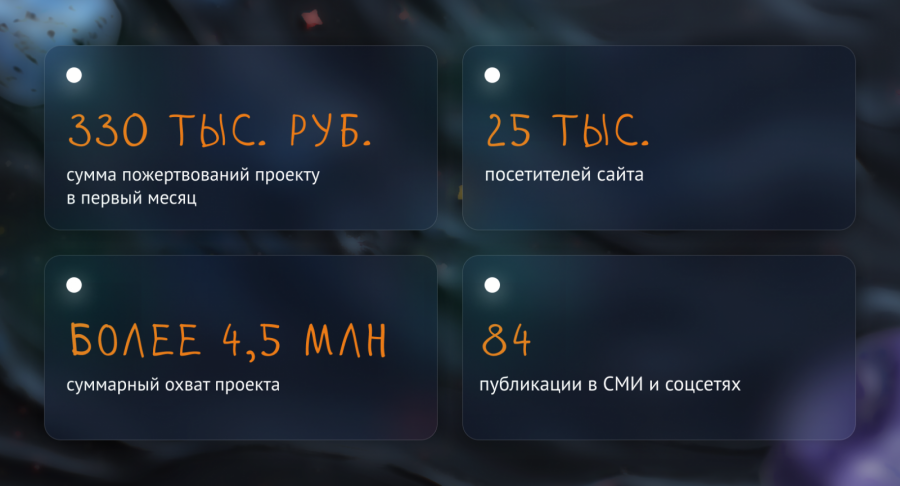 За первый месяц проект фонда смог собрать более 330 тыс. руб., что стало важным шагом для его дальнейшего развития. Благодаря включению целой команды агентств, проект получил широкий охват. На некоммерческой основе удалось инициировать: