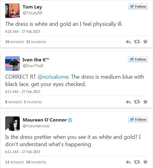 Публикации о странном платье появились у изданий Wired, BuzzFeed и Mashable. Хэштег #TheDress вышел в топы Twitter, а пользователи никак не могли сойтись в едином мнении. Свое мнение высказали Тейлор Свифт, Ким Кардашьян и Канье Уэст, а ученые объяснили природу иллюзии: различное цветовое восприятие возникало из-за индивидуальных особенностей зрения.