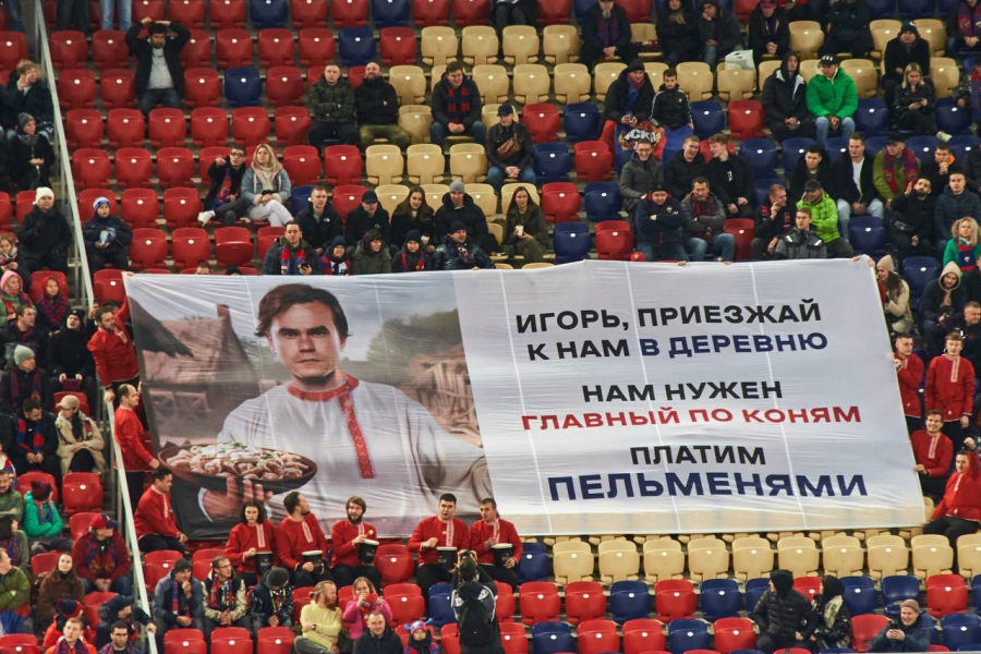 В середине матча фанаты развернули баннер, с помощью которого пригласили Игоря Акинфеева стать главным по коням в их деревне. На транспаранте изображен капитана ЦСКА в центре русского села в крестьянской рубахе и с пельменями — их голкиперу предложили в качестве гонорара за работу.
