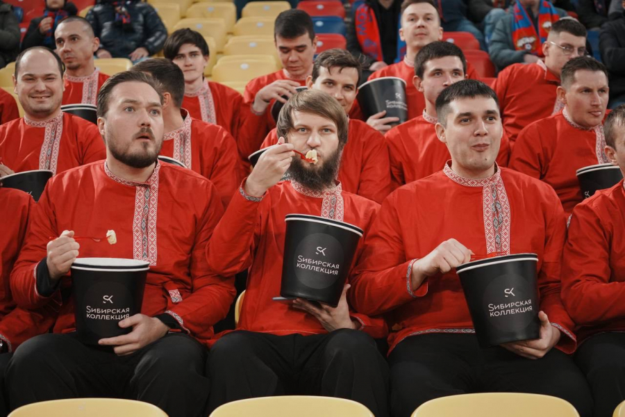 На матче ЦСКА и Нижнего Новгорода на центральной трибуне появились необычные зрители. 20 человек, одетые как крестьяне XIX века, смотрели игру и ели пельмени.
