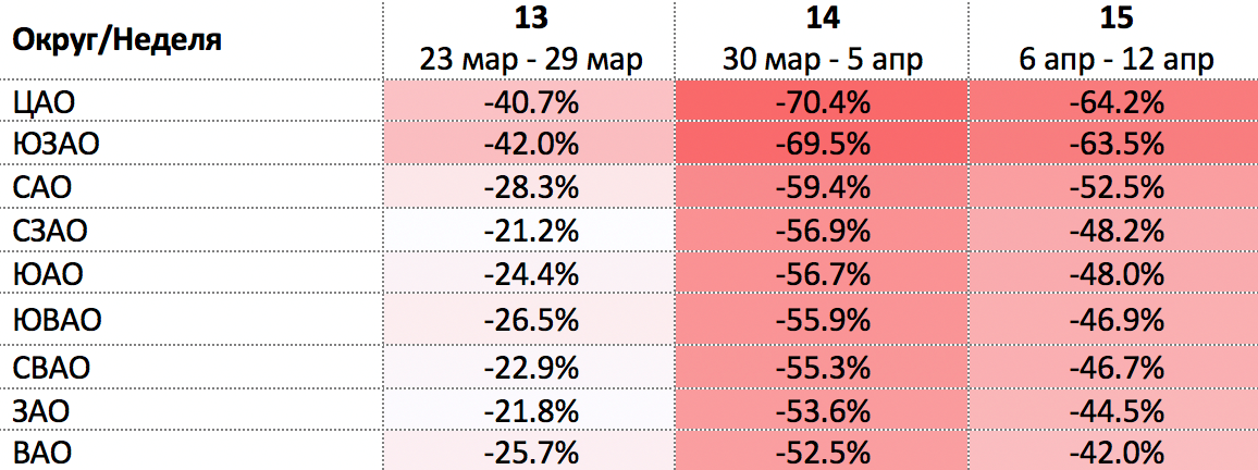Снижение рейтингов неравномерно распределено по всей территории городов — максимальное снижение ожидаемо происходит в центральных районах, это можно увидеть на примере Москвы: