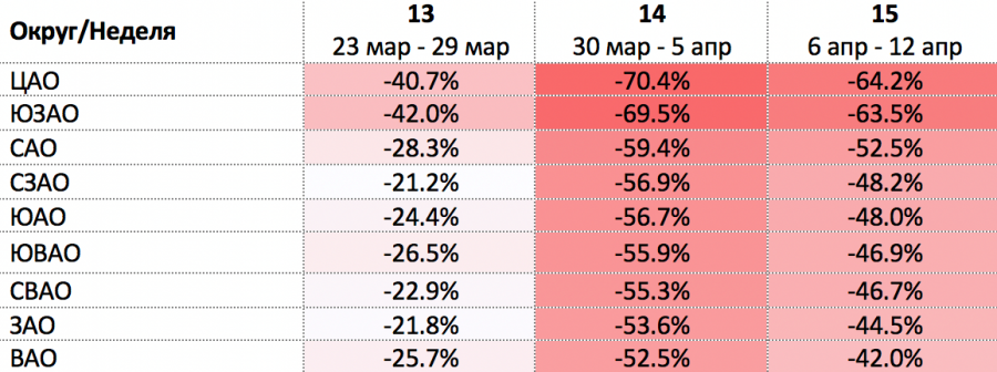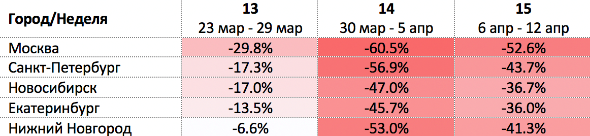 Интересно, что пик падения пришелся на 14-ую неделю, а на 15-ой по всем пяти городам наблюдается тенденция к возвращению людей на улицу. На 16-ой неделе в Москве местные власти запустили механизм пропусков, который, скорее всего, значительно ограничит наблюдаемый тренд в столице.