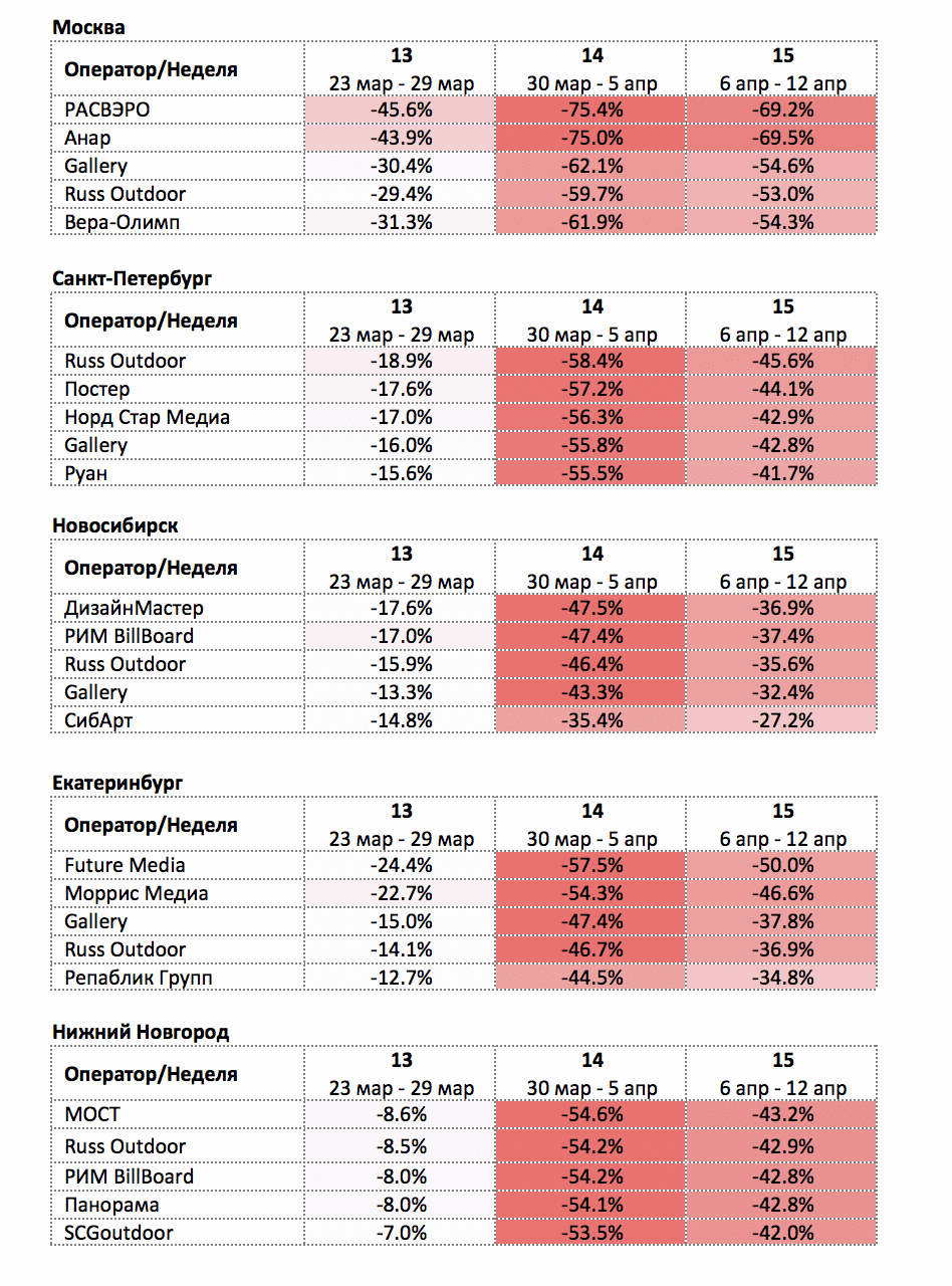 Массовая самоизоляция в городах России в наибольшей степени ударила по отрасли наружной рекламы, чьим товаром являются «рейтинги и просмотры» рекламных конструкций. В начале апреля суммарный GRP (Gross Rating Point, суммарный рейтинг, набранный в результате рекламной кампании — прим. Sostav) по всем конструкциям в Москве упал более чем на 60%.