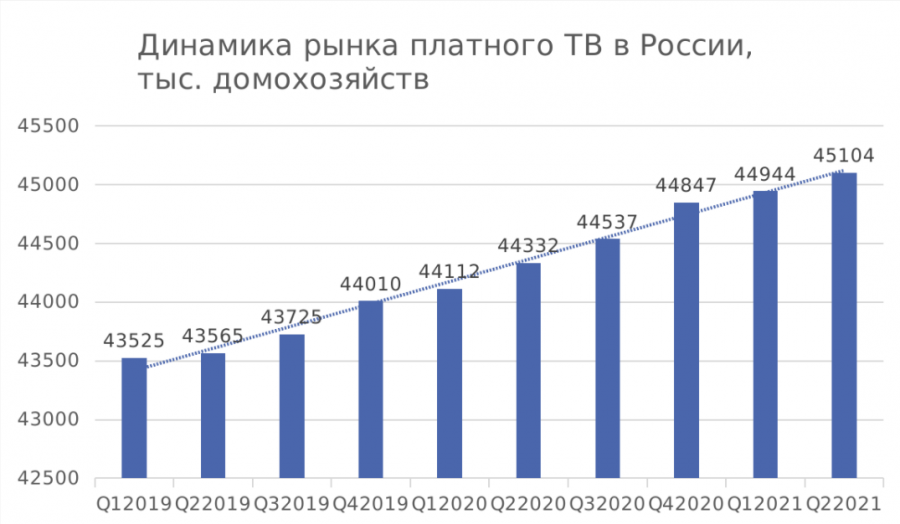 Общее количество абонентов платного ТВ в России во втором квартале 2021 года выросло на 160 тыс. и достигло 45,1 млн домохозяйств, согласно предварительным итогам TelecomDaily (есть в распоряжении Sostav).