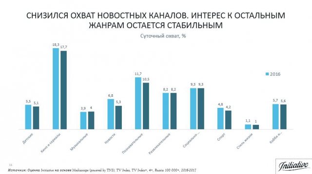 Стабильными остаются предпочтения аудитории тематического ТВ по жанрам. Наибольший интерес у зрителей по-прежнему вызывают сериалы, кино и познавательные программы. TOP 10 тематических каналов по суточному охвату (все 12−64, 100 000+) выглядит следующим образом: ОТР (7,9%), «Мир» (7,8%), «Дом Кино» (6,2%), «ТВ 1000 Русское Кино» (5,3%), «ТВ 1000» (4,2%), «Мульт» (4%), «Русский роман» (3,7%), Discovery (3,4%), «ТВ 1000 Action» (3,1%), РБК ТВ (2,9%). Наиболее заметное снижение охвата наблюдалось у новостных каналов: с 6,8% до 5,3%. Среди музыкальных каналов наибольший рост охвата зафиксирован у ТНТ Music (+133%).