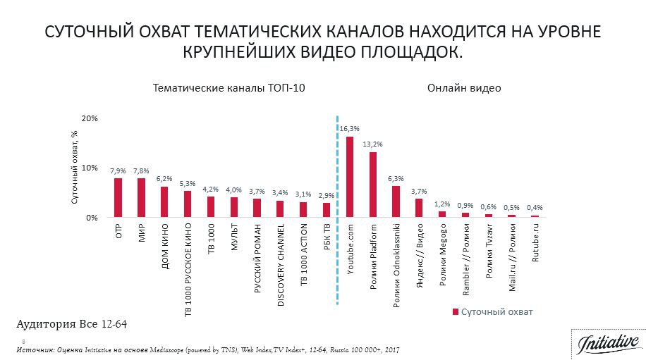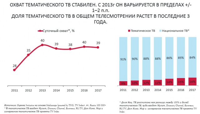 Последние три года доля тематического ТВ в общем телесмотрении растет. В 2017 году она достигла 16%. При этом тенденцию роста можно назвать стабильной (+1−2 п.п. ежегодно). «На сегодняшний день по своему охвату тематическое ТВ близко к онлайн-видеоплощадкам, лишь немного уступая в процентах. Возможно, в дальнейшем их ждёт параллельное развитие, например, через платформу Smart TV», — отмечает Анна Мазурина, гендиректор Initiative, CEO Mediabrands Russia.