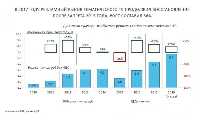 «Рекламный рынок тематического ТВ продолжает свое восстановление после кризисного периода и запрета рекламы в 2015 году. В прошлом году рост составил 36%. Однако динамика роста замедлилась по сравнению с 2016 годом. Мы ожидаем, что в текущем году рекламный рынок тематического ТВ вырастет на 25%», — добавляет Анна Мазурина.