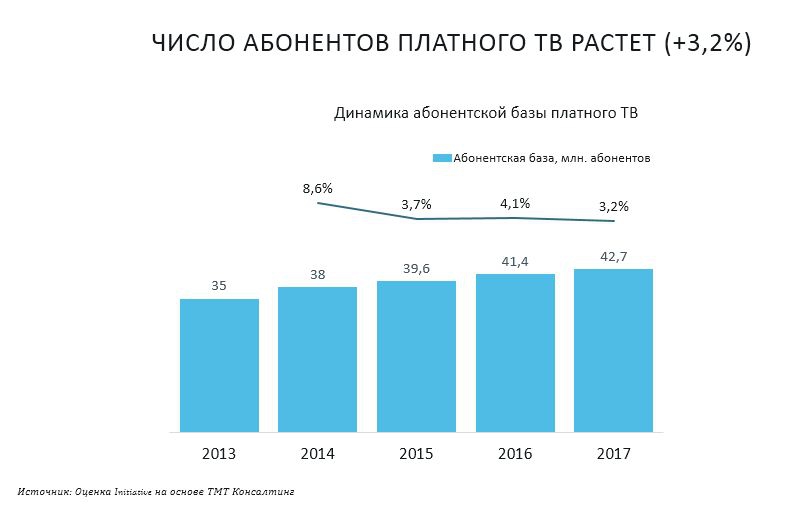 Абонентская база платного ТВ в России замедлила рост: в 2017 году она увеличилась на 3,2% и достигла 42,7 млн человек. Драйвером роста являлся IPTV, который показал положительную динамику в пределах 13%. Однако темпы роста сегмента также замедлились: в 2016 году он прибавил 17,6%, говорится в исследовании агентства