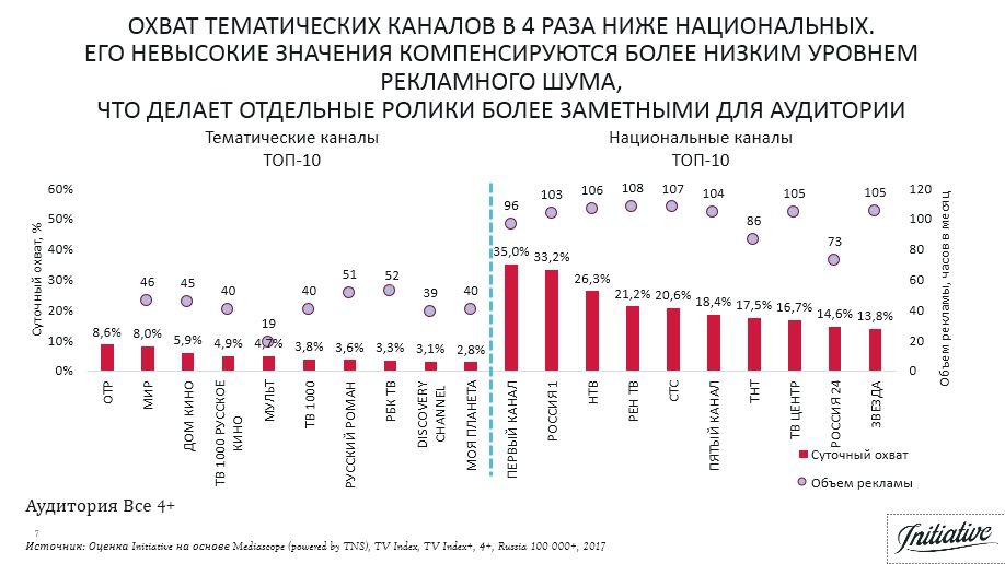 Суточный охват тематических каналов он остается стабильным и с 2013 года варьируется в пределах +/-1−2 п.п. Несмотря на то что охват тематических каналов в 4 раза ниже национальных, его невысокие значения компенсируются более низким уровнем рекламного шума, и это положительно влияет на заметность рекламы.