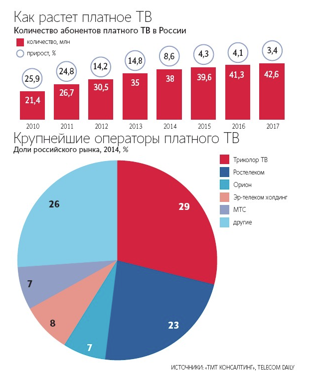 Под платным телевидением аналитики подразумевают спутниковое, кабельное и интернет-ТВ (IPTV), которое предлагает абонентам расширенные пакеты телеканалов и изображение лучшего качества. По данным компаний, в 2017 г. проникновение платного ТВ по домохозяйствам в России впервые достигло 75%. Рынок перенасыщен, что и замедляет рост.