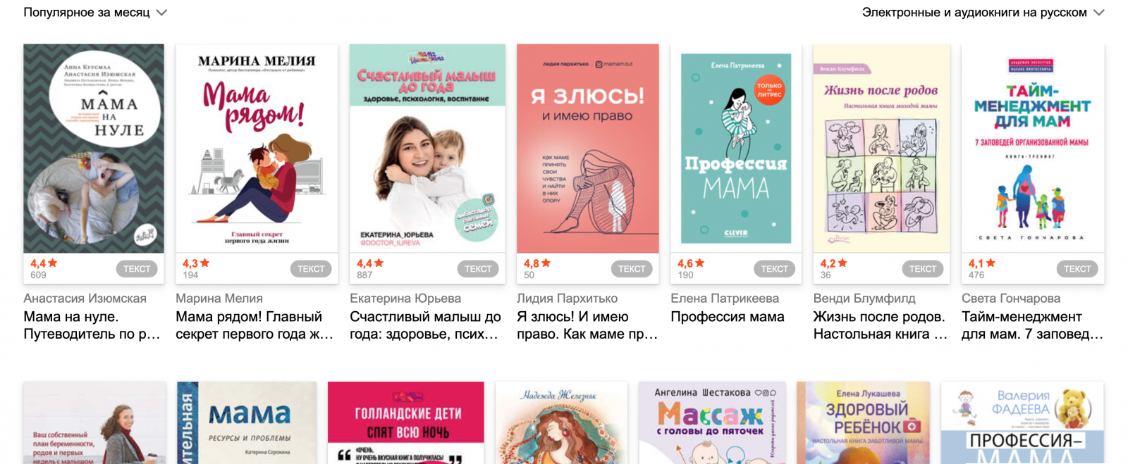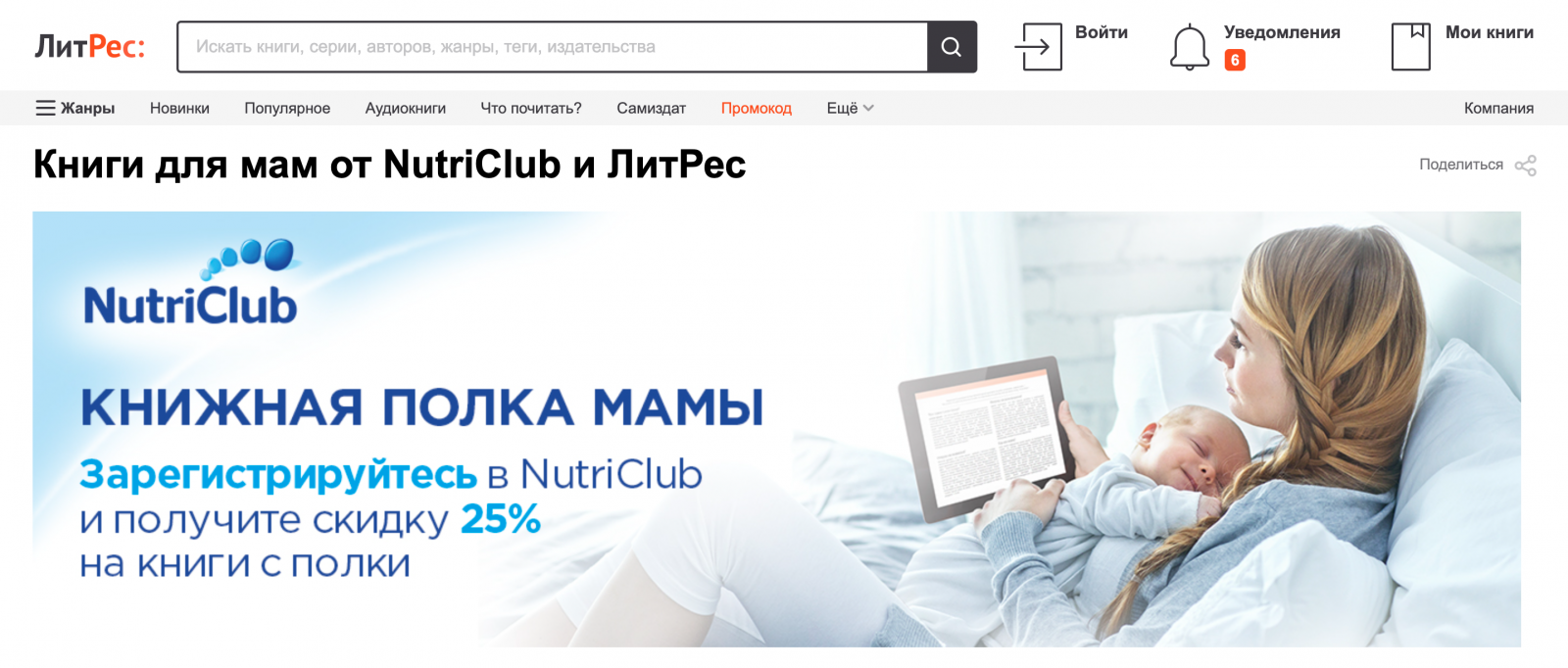 Некоторым мамам хочется углубиться в изучение конкретных вопросов, но они не знают, с чего начать. Чтобы помочь им, мы организовали коллаборацию с сервисом электронных книг «ЛитРес» и создали брендированную полку с полезными книгами о родительстве, одобренными экспертами NutriClub. Члены клуба получали скидку 25% на все книги с полки.