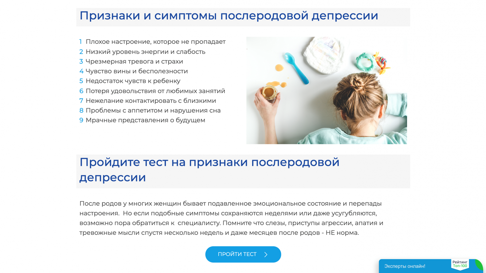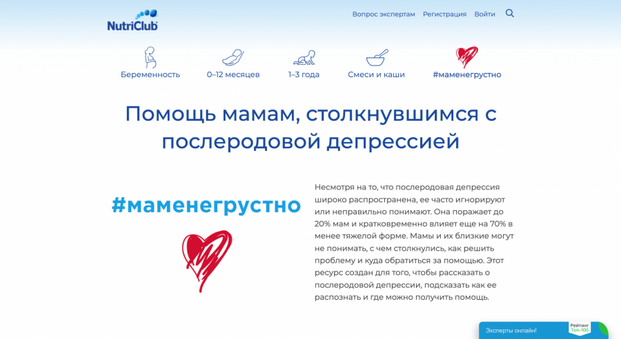 Мы создали отдельную страницу на сайте NutriClub, посвященную послеродовой депрессии. На сайте разместили информацию о расстройстве и специальный тест, который используют во всем мире для определения его симптомов. А ещё рассказали, куда обратиться за помощью: разместили телефоны горячих линий психологический помощи и контакты организаций поддержки мам.