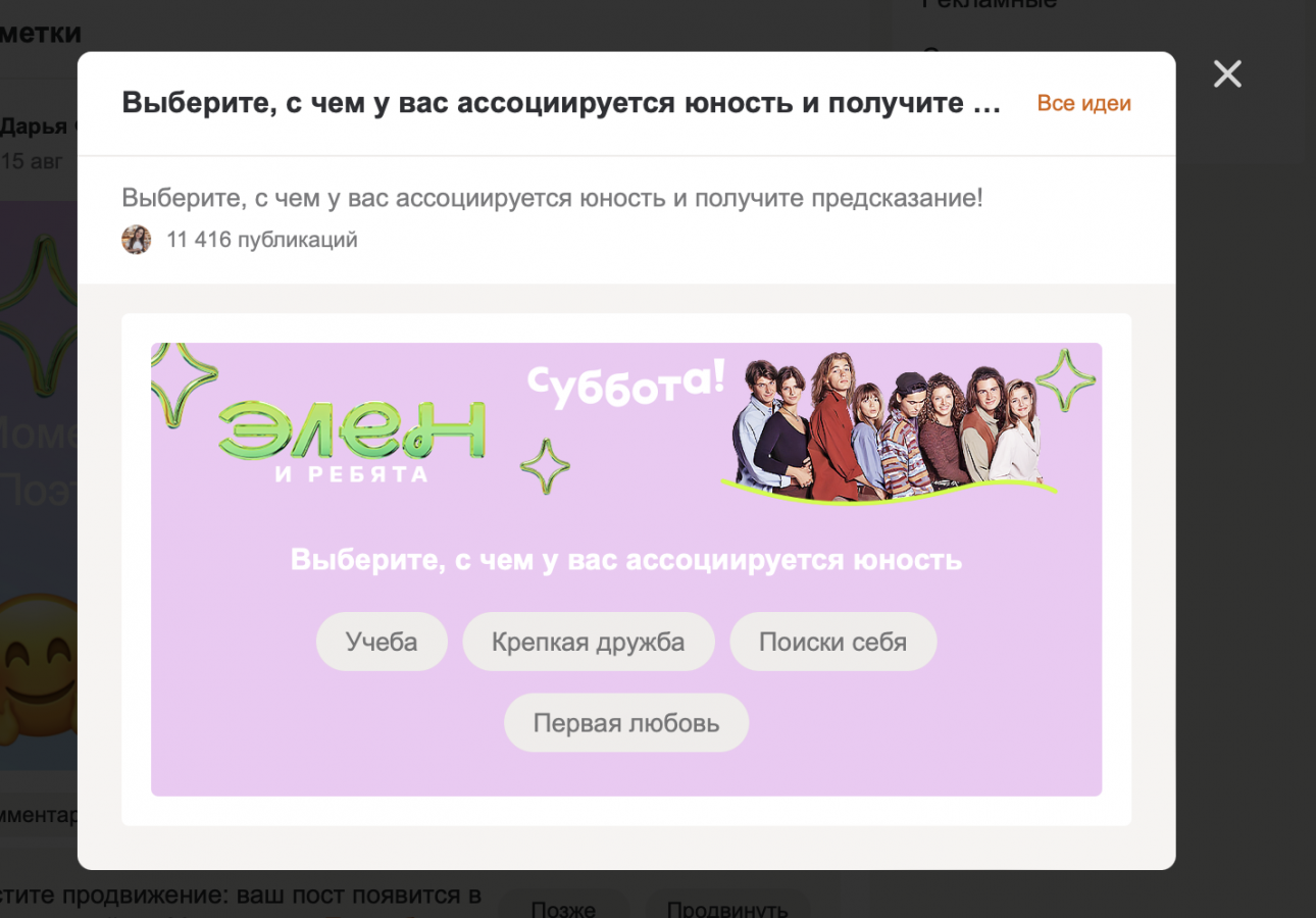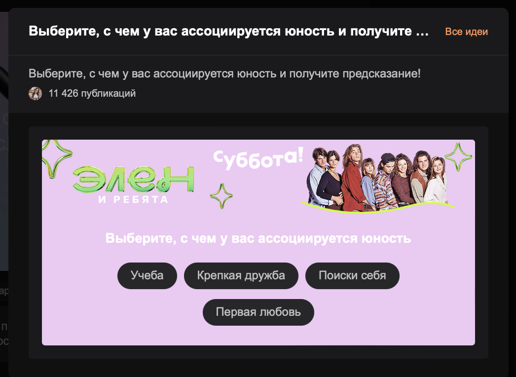 Многомиллионная аудитория ОК активно интересуется тематикой кино и сериалов. Пользователи следят не только за новыми релизами в индустрии, но и любят пересматривать такие картины. Среди них сериал «Элен и ребята», для продвижения которого мы предложили пользователям вспомнить университетские годы и принять участие в интерактивных механиках: поделиться своими архивными фото, создать собственный плейлист с песнями из юности, установить тематические рамки на аватар и принять участие в рубрике с персональными предсказаниями.