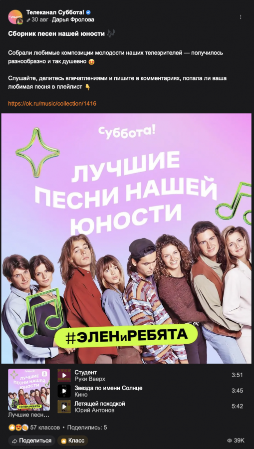 «Суббота!» стартовал показ молодежного ситкома «Элен и ребята». Для продвижения сериала «Суббота!» и «Одноклассники» (ОК) предложили зрителям вспомнить университетские годы и создать плейлист телеканала на витрине ОК. Общий охват постов в рамках спецпроекта составил почти 2 млн. человек. Об этом Sostav рассказала команда телеканала.