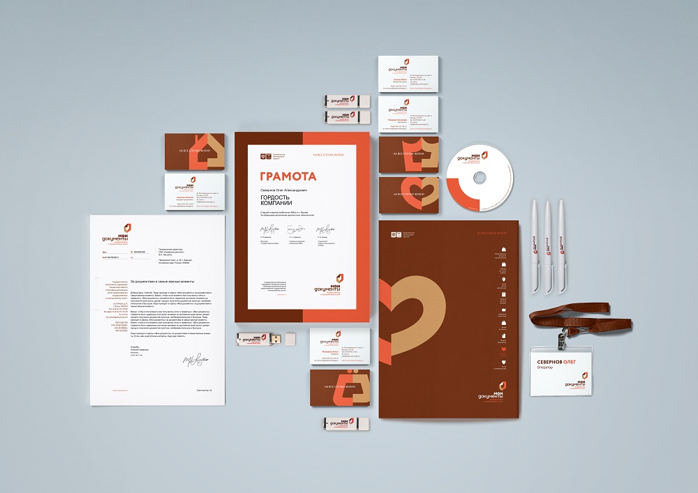 В рамках проекта разработан единый для всех регионов страны бренд, ставший отражением существующих возможностей и особенностей новой организации системы предоставления государственных и муниципальных услуг в МФЦ. Создано Руководство по использованию единого фирменного стиля, описывающее единые навигационные стандарты, правила использования идентификации бренда и оформления носителей бренда в рамках деятельности центров и офисов государственных и муниципальных услуг с учетом их различия по видам и размерам, в том числе, наружное и внутреннее оформление помещений, фасадов зданий, транспорта, дорожных знаков, корпоративной одежды, деловой документации, рекламных и маркетинговых материалов, сувенирной продукции, а также принципы присутствия бренда в цифровой среде, в сети Интернет.