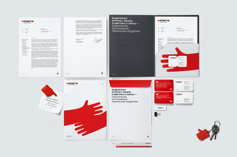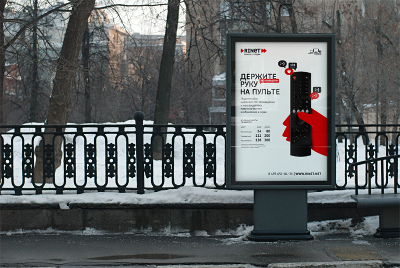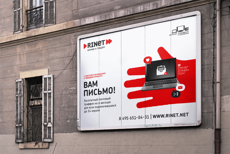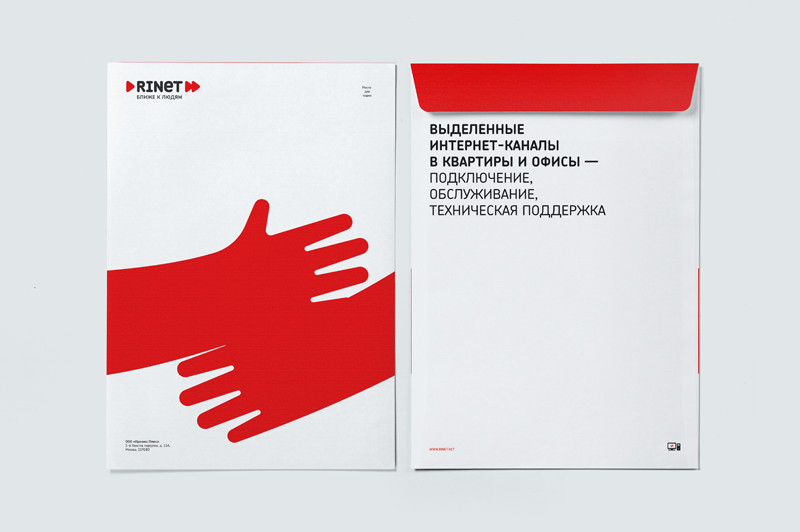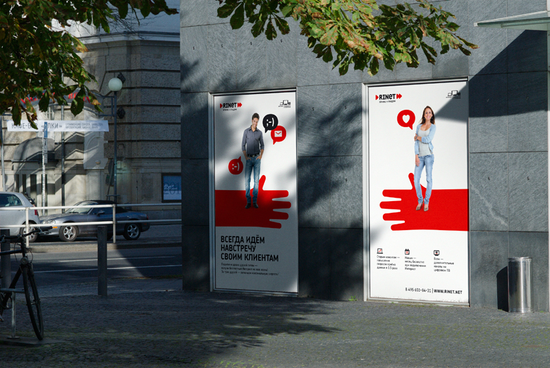 Rinet – относительно небольшой провайдер, и его коммуникации носят, по большей части, локальный характер. Бренду не нужны большие и дорогостоящие рекламные кампании, его «территория» - это дома клиентов, кафе и магазины в районах обслуживания, небольшие сити-форматы. Такие особенности коммуникаций делали разработку визуальной системы сложной и интересной для агентства.