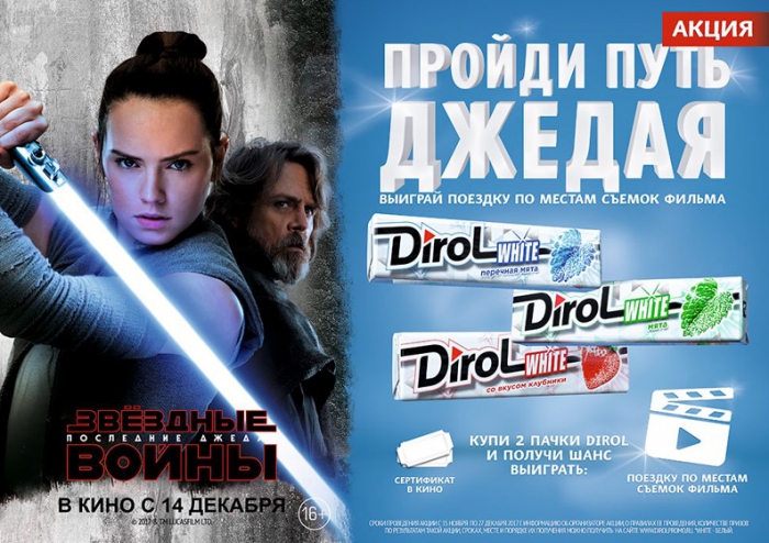 В преддверии мировой премьеры нового эпизода культовой саги «Звёздные Войны» известный бренд жевательной резинки Dirol и компания Disney в России запускают уникальную акцию для потребителей «Выиграй поездку от Dirol».