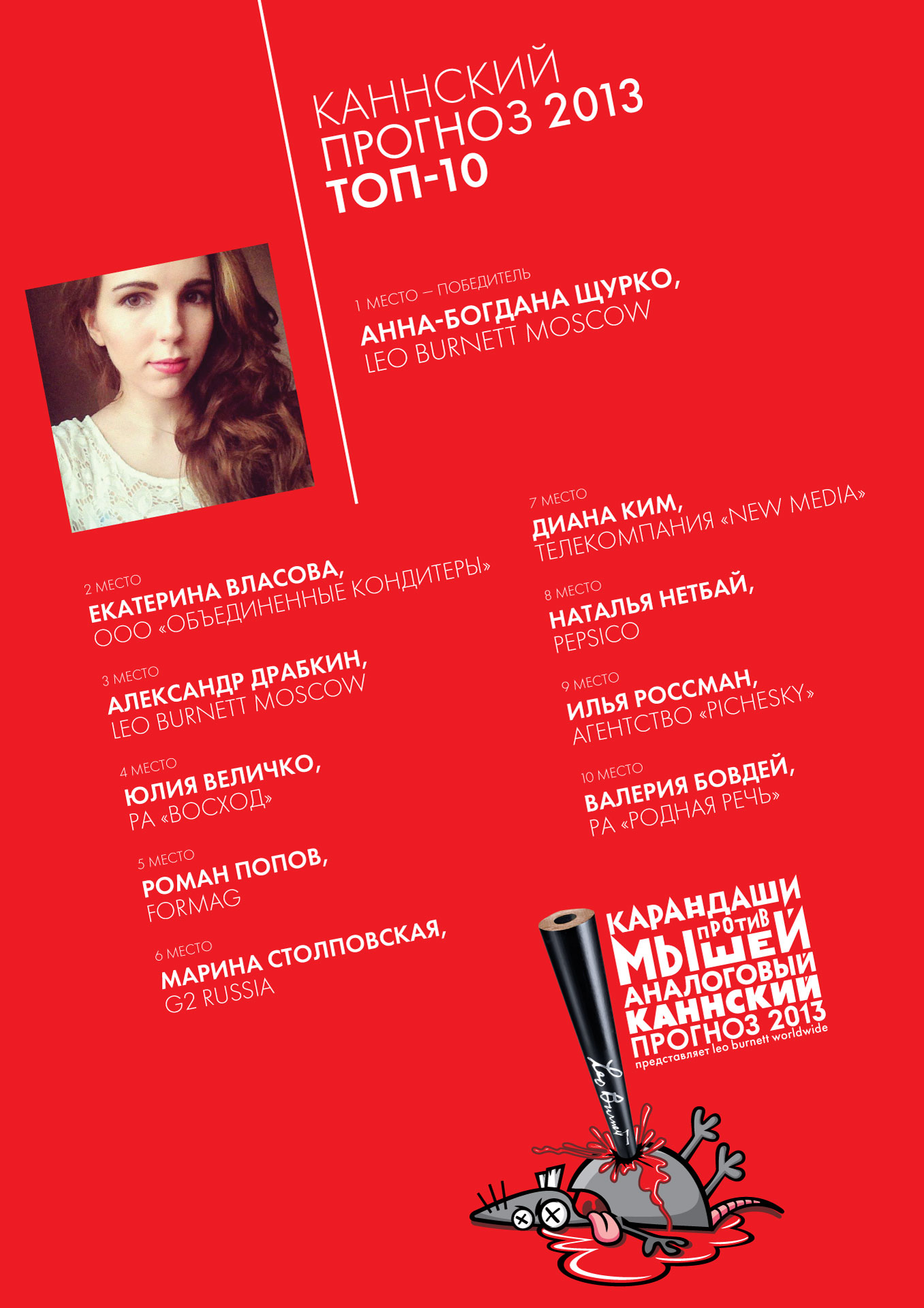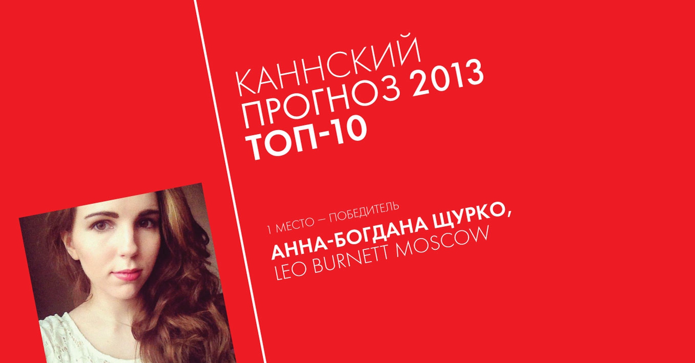 В этом году главный приз - поездку на Каннский международный фестиваль рекламы 2014 - выиграла Анна-Богдана Щурко, младший стратег Leo Burnett Moscow, набравшая 1470 баллов из 1780 возможных. Всего в «Каннском прогнозе 2013» приняло участие 119 человек, а на само мероприятие пришло 200 человек.