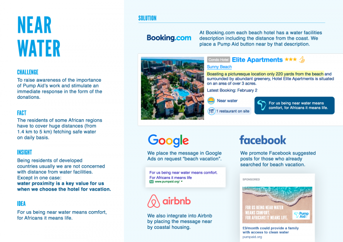 Организация Pump Aid, которая занимается обеспечением чистой воды самых бедных районов Африки, предоставила бриф для номинаций Film, PR, Media и Cyber. Творческие команды должны были повысить осведомленность о важности работы Pimp Aid и привлечь пожертвования.